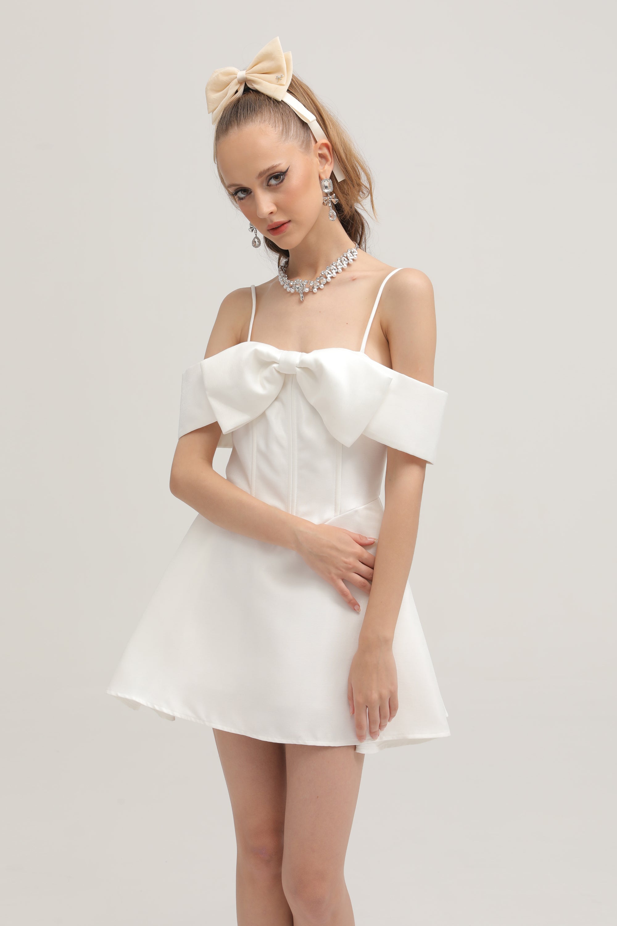 Elva white bowknot flared mini dress